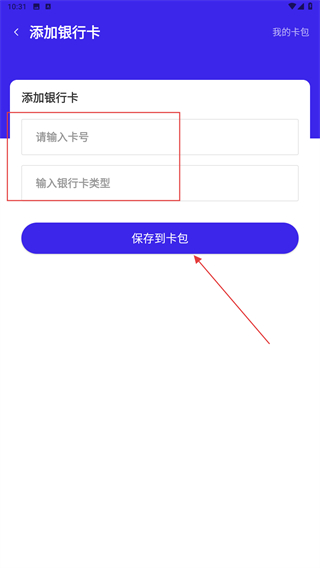 4、在添加的界面内,输入要添加的银行卡卡号以及类型,再点击保存到卡包的按钮即可。