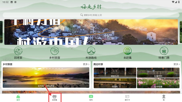 1、打开乡村旅游服务类应用,点击底部去赶集选项,进入乡村集市页面。