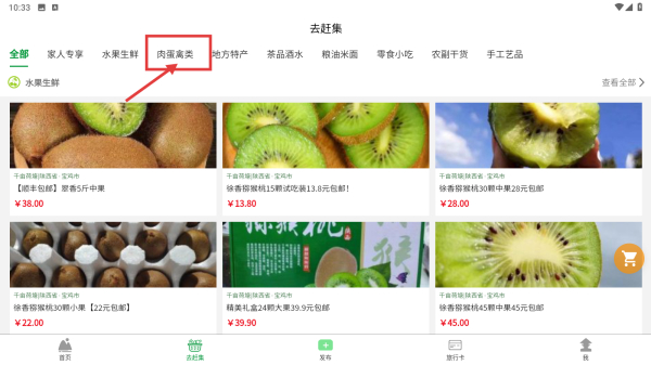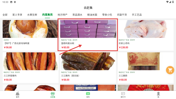2、在乡村集市页面,选择肉禽蛋类分类,进入该分类的商品列表页面。