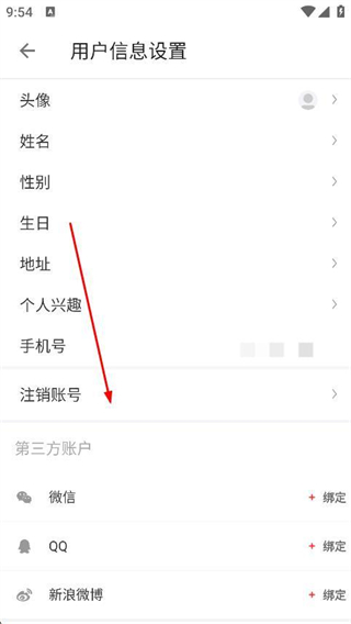3、在用户信息设置页面,下滑找到并点击注销账号选项。
