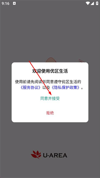 1、打开优区生活,在弹出的窗口中,点击同意并接受。