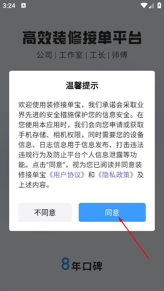 1、打开装修接单宝,弹出温馨提示,点击同意,进入软件首页。