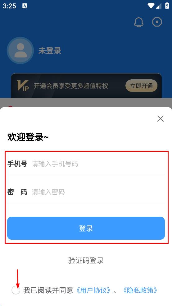 4、在登录界面输入手机号码和密码,勾选已阅读并同意相关协议后点击登录,完成登录操作。