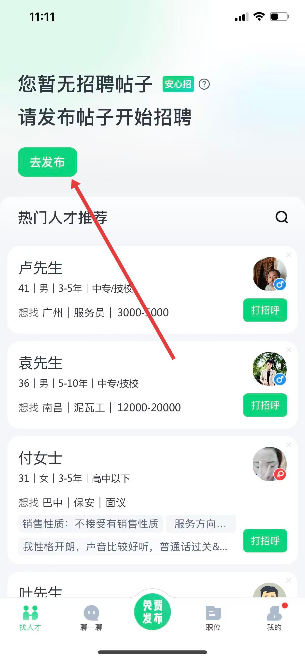 1、打开赶集招聘商家版App,在找人才页面中,点击去发布按钮。