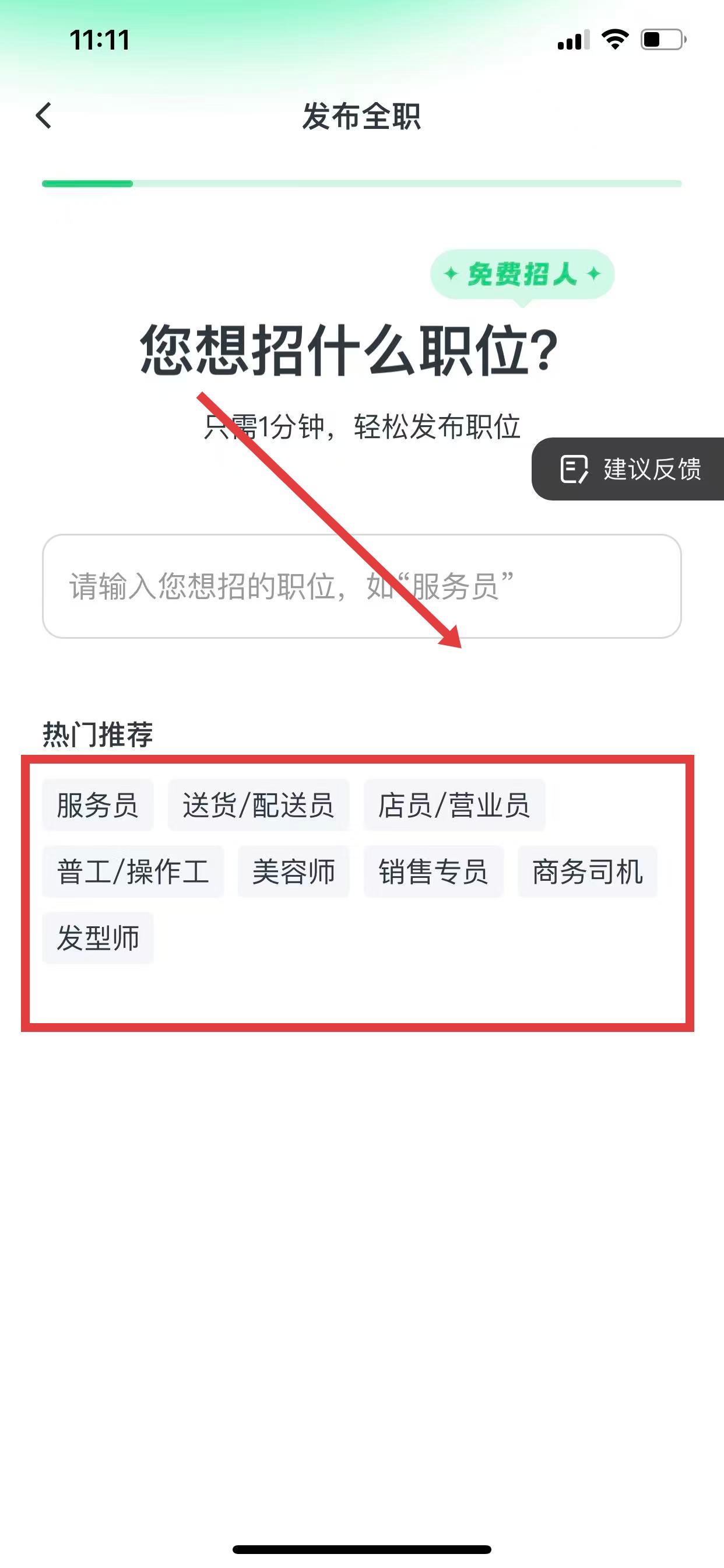 2、在发布全职页面,输入想要招聘的职位,也可以从下方热门推荐中,直接选择职位类别。