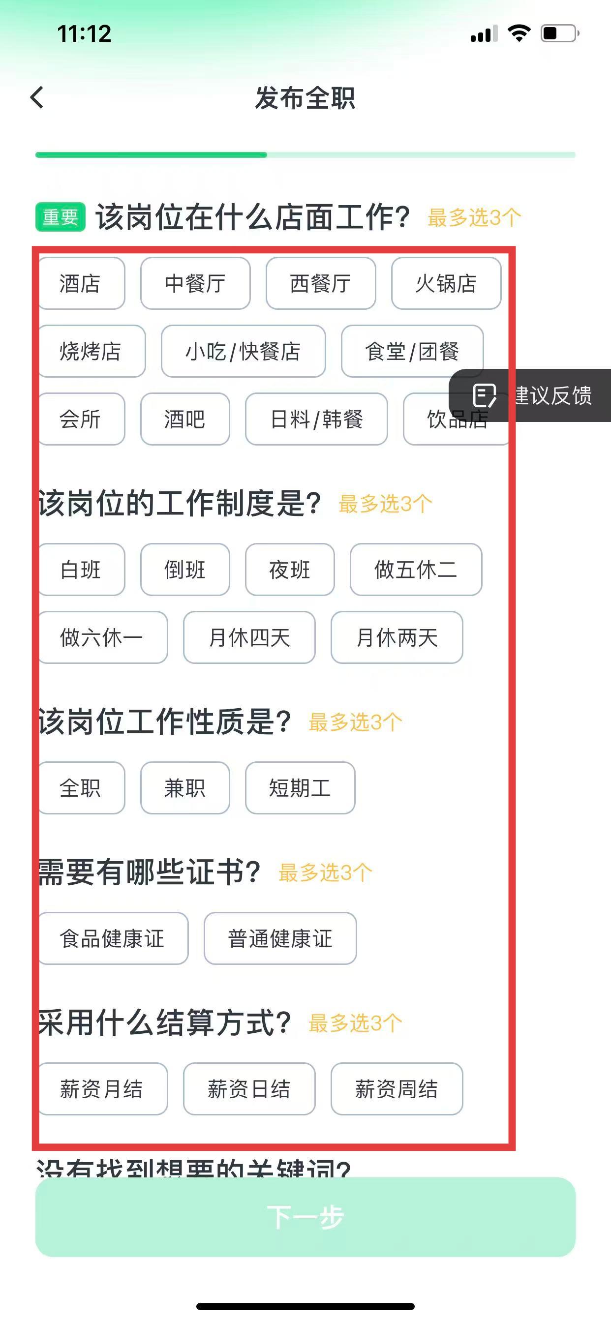 3、继续填写该岗位的工作地点类型、工作制度、工作性质、所需证书、薪资结算方式等相关信息,点击下一步。