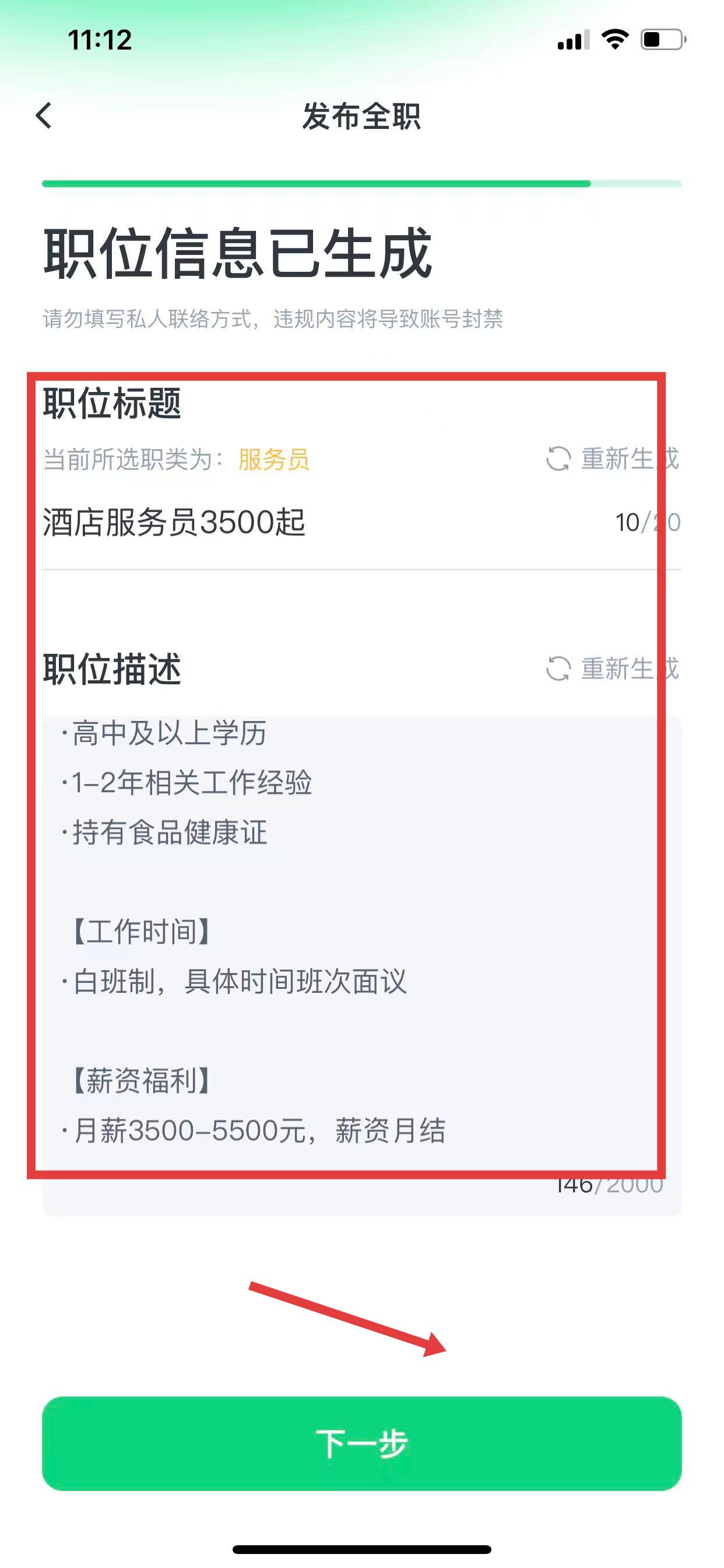 4、确认生成的职位信息,包括职位标题和职位描述等内容,点击下一步,即可成功发布招聘信息。