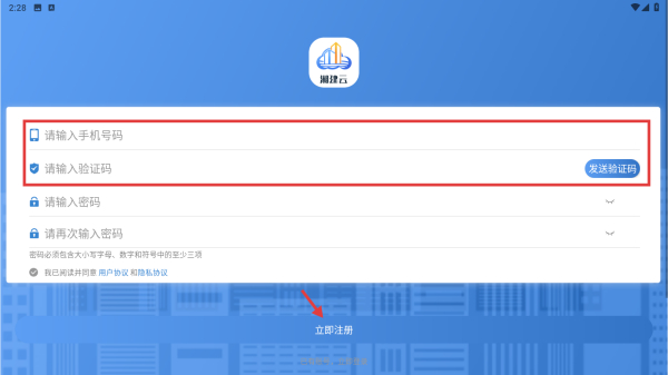 4、依次填写手机号码、验证码、设置密码等信息,勾选协议后点击立即注册按钮,完成账号注册。