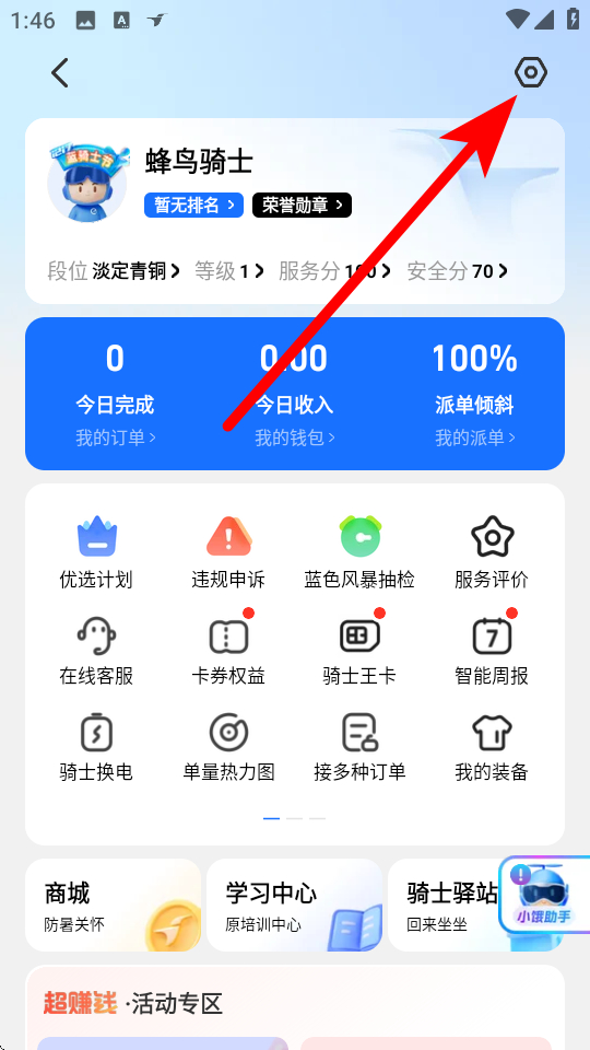 2、在个人中心的页面,点击右上角设置图标,进入设置的界面。