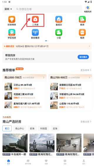 1、打开房产类应用,点击二手房入口,进入二手房房源列表页面。