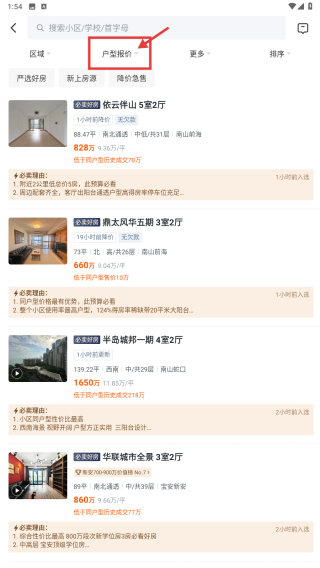 2、在房源列表页面,点击户型/总价筛选选项,进入筛选条件设置页。