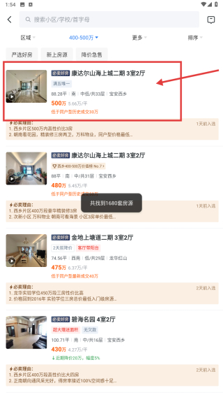 3、选择400-500万总价区间,点击确定按钮,应用筛选条件。