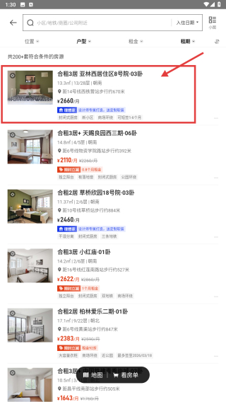3、点击查看房源按钮,加载符合条件的合租房源列表。