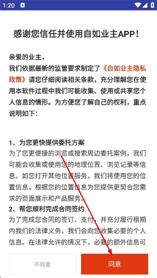 1、打开自如业主app,在弹出的页面,点击同意按钮。