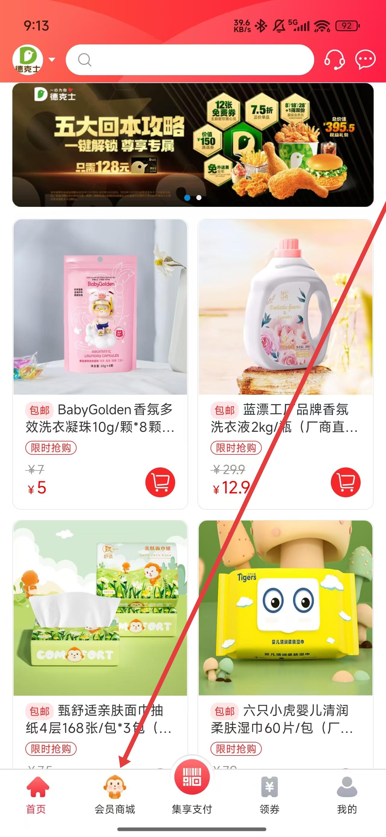 1、在应用的首页中,可以点击会员商城按钮,进入查看会员商品。