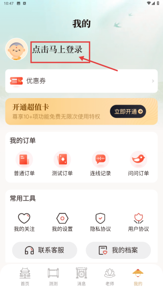 2、在个人中心,点击点击马上登录区域,进入登录选择界面。