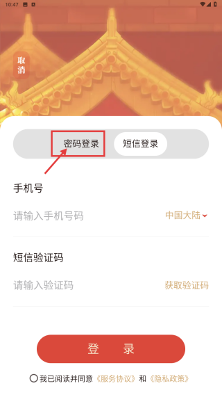 3、在登录界面,点击密码登录选项,切换至密码登录信息填写页。