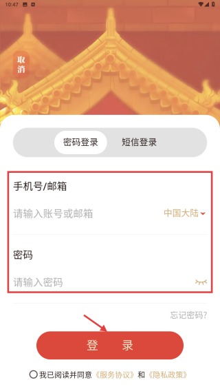 4、输入手机号/邮箱和密码,勾选协议后点击登录按钮,完成账号登录。