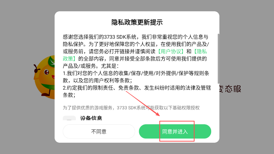 1、打开游戏后会看到游戏协议,得点一下同意,要是不同意的话,就没法继续使用游戏里的各种功能,这一步可不能跳过哦。