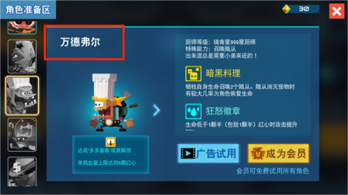 2、万德福尔角色需生命值累积至六颗心解锁,其技能以消耗自身生命为代价召唤两名僵尸仆从。