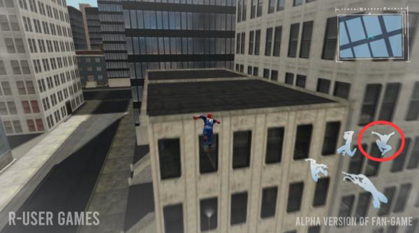 3、长按两下如图所示位置便可以吐出蛛丝,飞向附近的建筑物内。