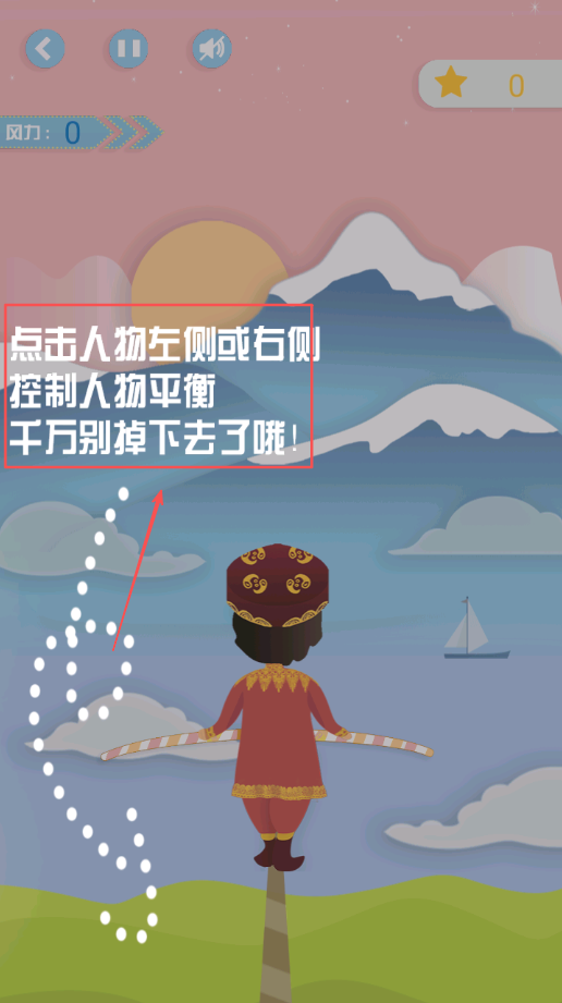 2、接着熟悉操作方式,通过左右点击平衡杆,或是利用手机重力感应来控制人物平衡,找到操作的手感。