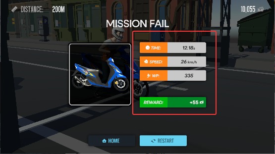 4、冲过终点线后系统会计算分数,根据表现奖励金币,攒够钱就能解锁更高级的摩托车。