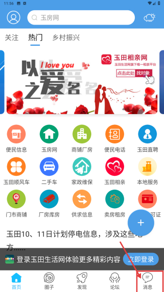 1、打开玉田生活网应用,点击底部消息选项,进入消息页面。