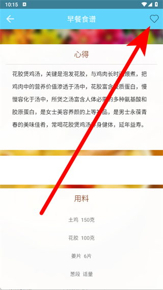 4、进入食谱详情页后,查看用料、做法等内容,点击右上角心形图标可收藏该食谱。