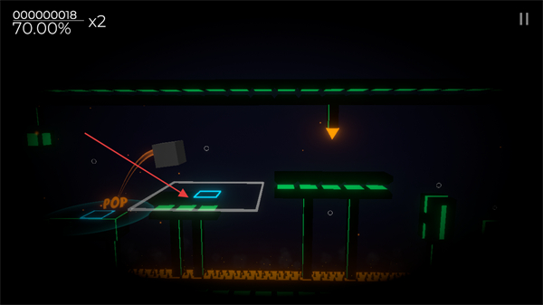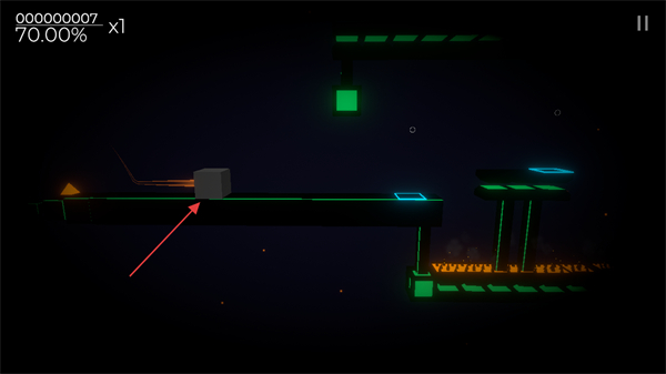 1、进入游戏,操控方块在平台上移动,屏幕左上角显示分数和倍数,如0000000007x1,70.00%可能是通关进度。