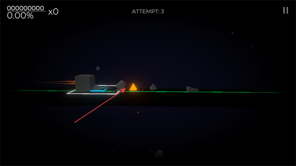 2、遇到三角形障碍物时,控制方块跳跃躲避,避免碰撞。