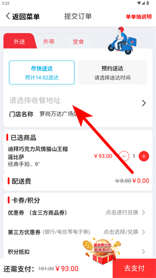 3、选好商品后,点击页面下方去结算,进入提交订单页面,选择外送选项,并选择尽快送达或预约送达,再选择准确的收餐地址。