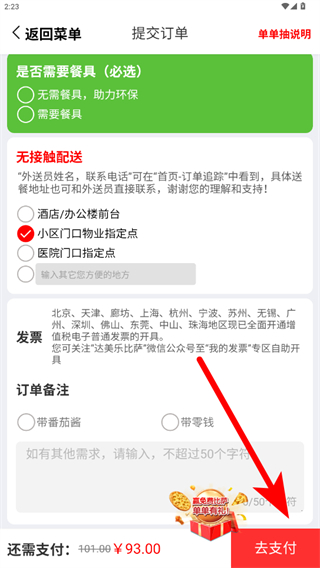 4、根据需求选择是否需要餐具、无接触配送地点等信息,确认订单信息无误后,点击支付完成付款,即可成功下单。