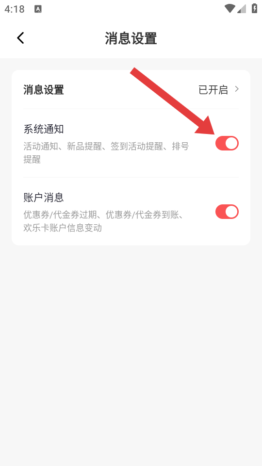 4、在消息设置页面,找到系统通知,点击其右侧的开关,将系统通知功能开启。