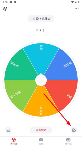 1、打开随机大转盘app,进入转盘界面,点击想要删除选项对应转盘右下角的编辑图标,进入新建转盘页面。