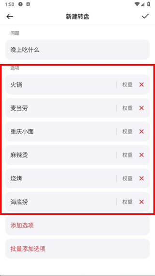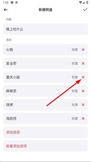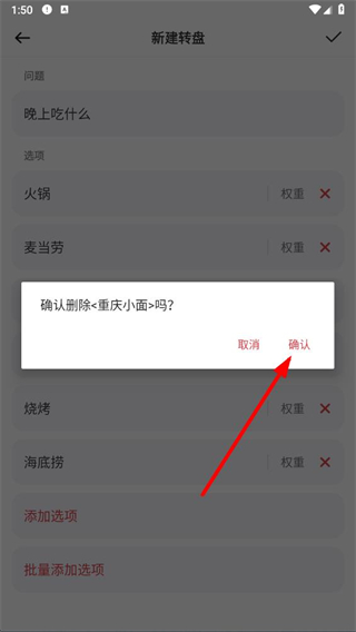 2、在新建转盘页面,找到需要删除的转盘信息选项,比如重庆小面。