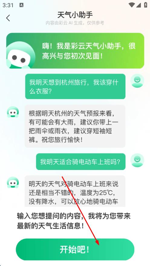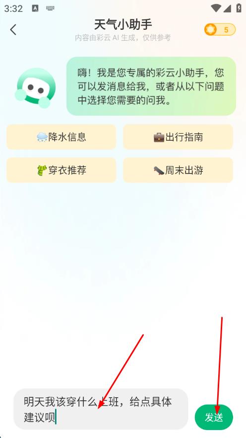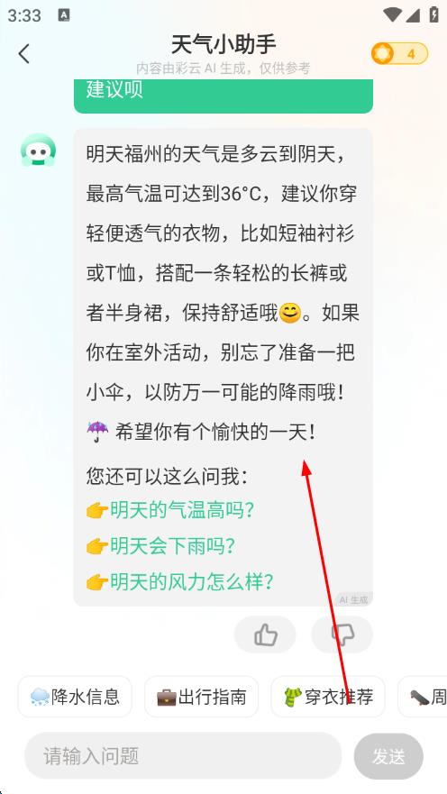 3、在输入框中输入想要咨询的天气相关问题,点击输入框右侧的发送按钮,