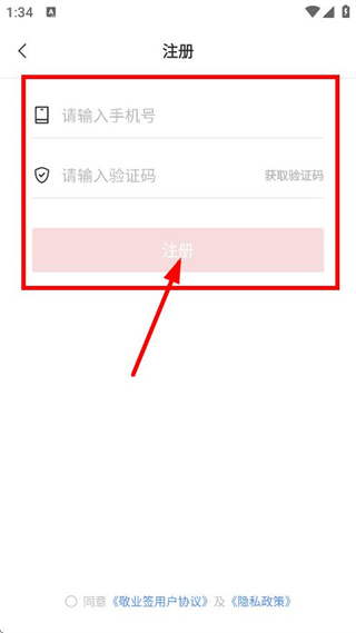 1、在用户协议及隐私政策弹窗中,点击同意,进入敬业签登录注册页面。