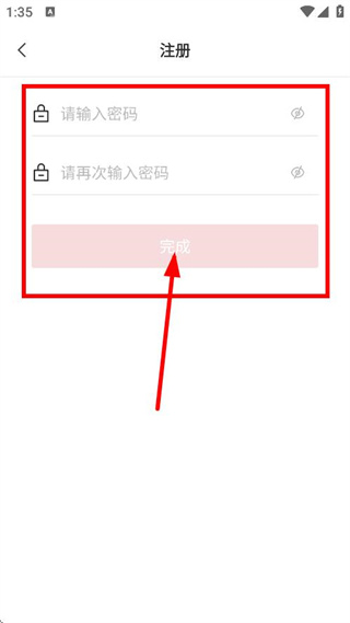 4、在密码设置页面,输入密码并再次确认密码后,点击完成,完成注册操作。