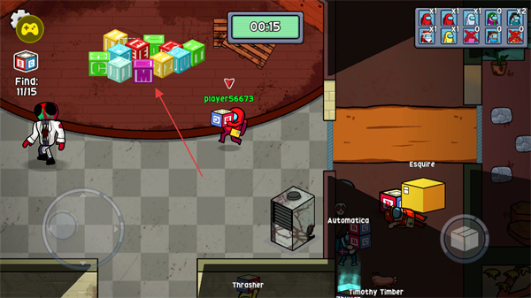 1、进入游戏后,通过屏幕左下方的虚拟摇杆操控角色移动,注意左上角Find:11/15显示的是需要收集的目标物品数量进度。