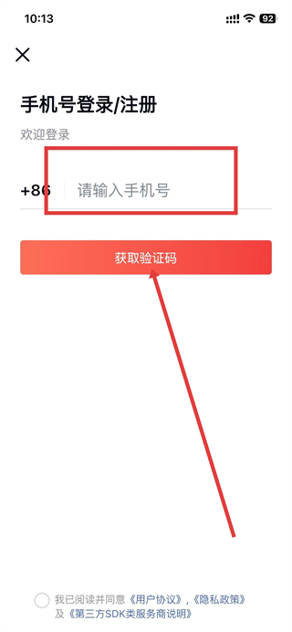 3、进入手机号登录/注册页面,输入手机号,点击获取验证码。