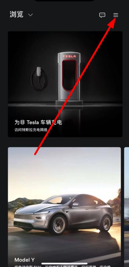 1、打开特斯拉app,在浏览界面点击右上角三条横线图标进入菜单。