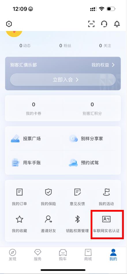 2、在我的页面中,下滑找到并点击车联网实名认证按钮。