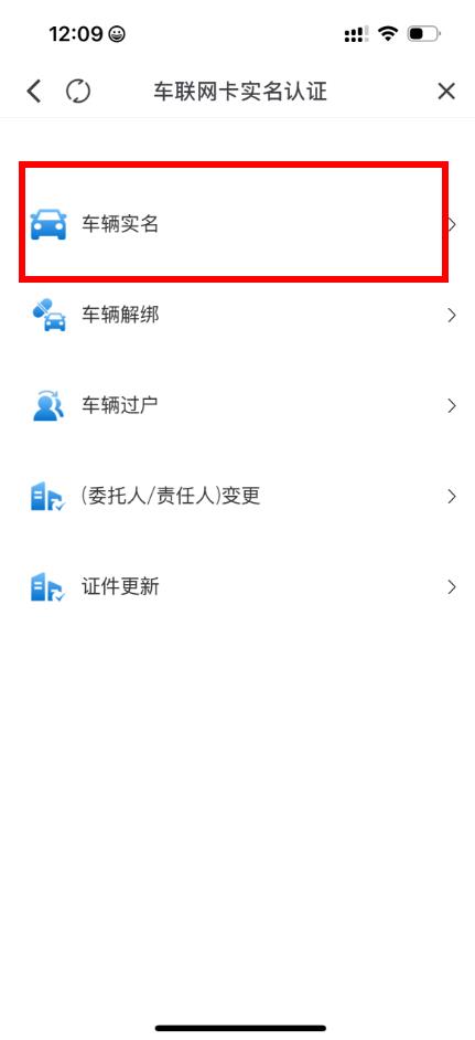 3、进入车联网卡实名认证界面后,点击车辆实名选项。