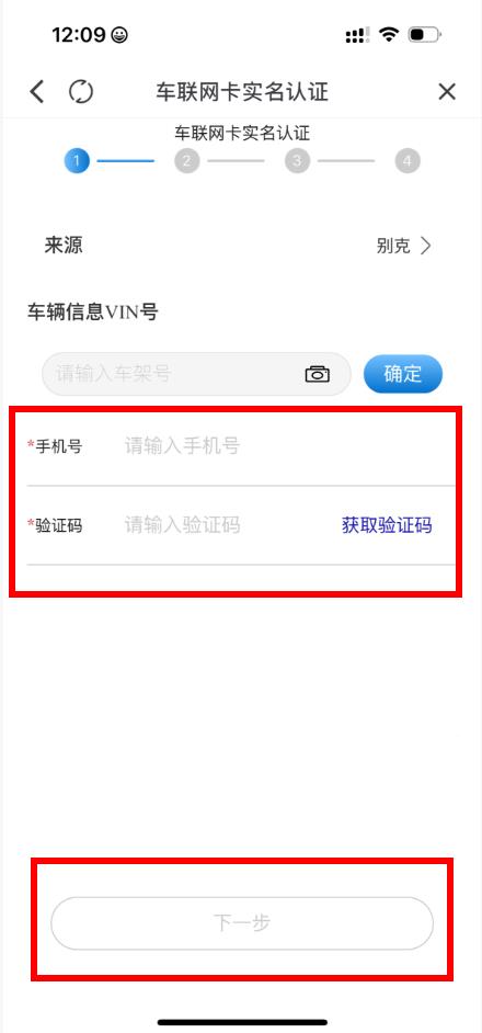 4、在新页面中,依次输入车辆信息VIN号,填写手机号并点击获取验证码,输入收到的验证码后,点击下一步,按照后续提示完成实名认证操作。