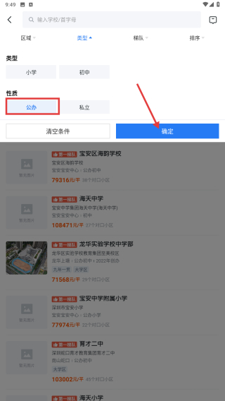 3、点击确定按钮,筛选出公办性质的学区房列表。