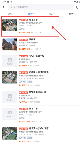 4、在列表中,找到育才三中学区房条目,查看其均价102953元/平及相关信息。