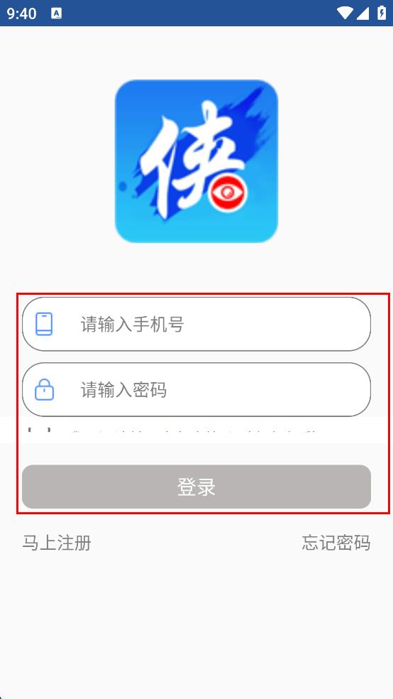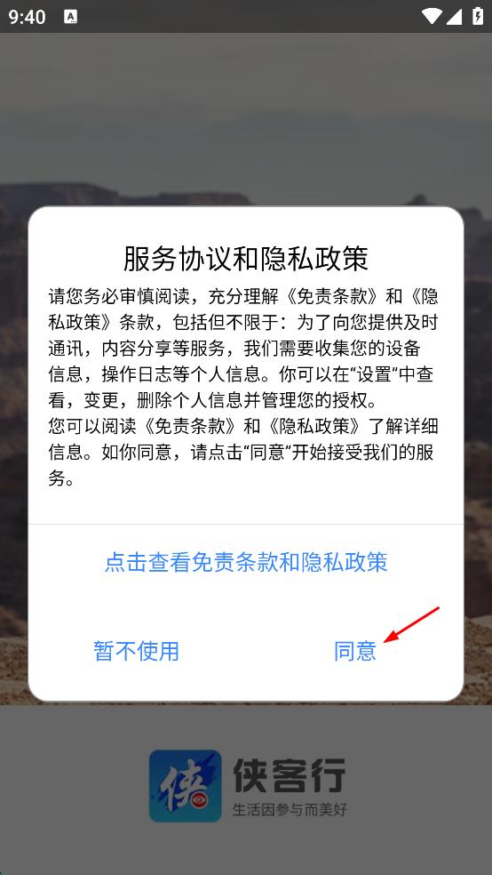 1、打开侠客行APP,在弹出的服务协议和隐私政策页面,点击“同意”按钮,进入APP主界面。
