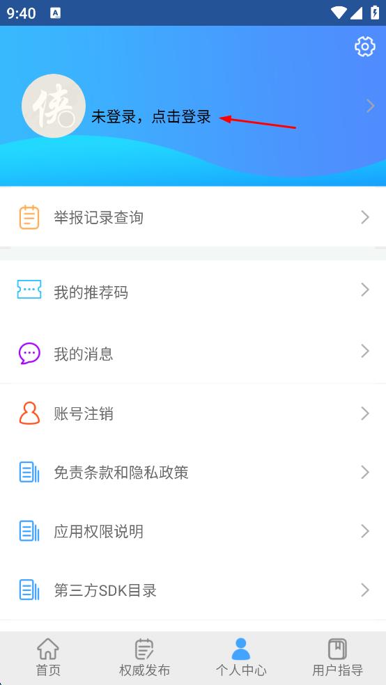 3、在个人中心页面上方,找到“未登录,点击登录”选项并点击,进入登录界面。