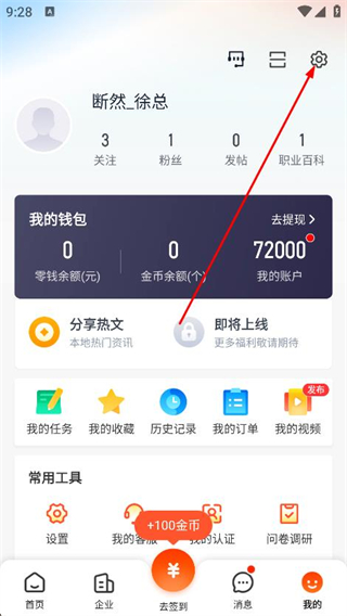 2、在我的页面中,找到并点击右上角的设置图标。